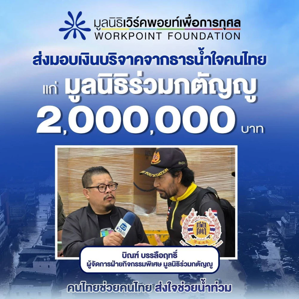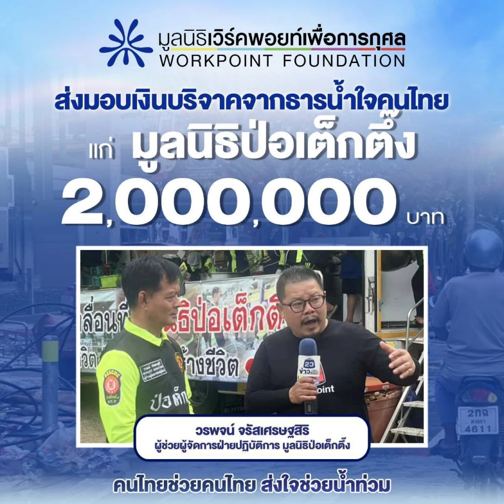 ช่องเวิร์คพอยท์ 23 นำโดย คุณสมภพ รัตนวลี ผู้อำนวยการฝ่ายข่าว เป็นตัวแทนส่งต่อธารน้ำใจจากพี่น้องประชาชน จากโครงการ"คนไทยช่วยคนไทย ส่งใจช่วยน้ำท่วม" โดยมูลนิธิเวิร์คพอยท์เพื่อการกุศล เพื่อช่วยบรรเทาความเดือดร้อนให้ผู้ประสบภัยน้ำท่วม พร้อมส่งกำลังใจไปยังทุกพื้นที่