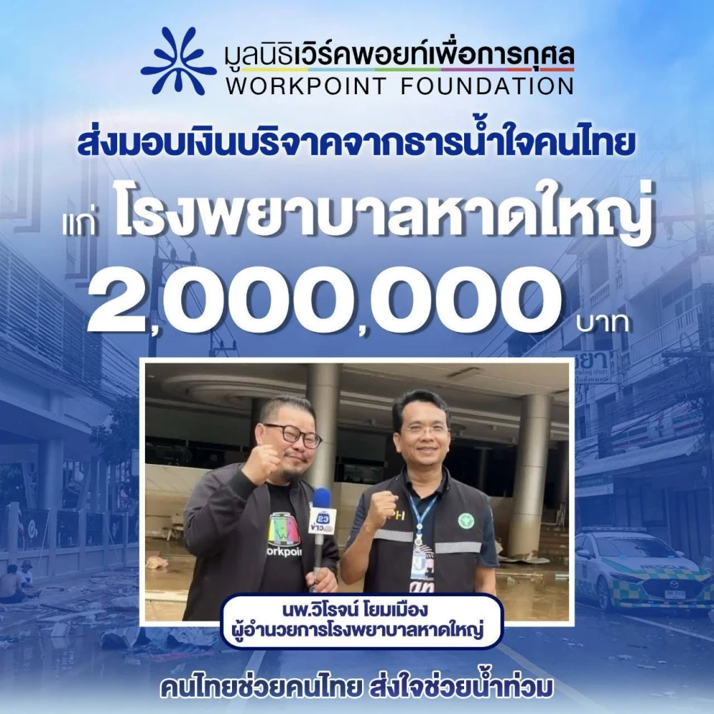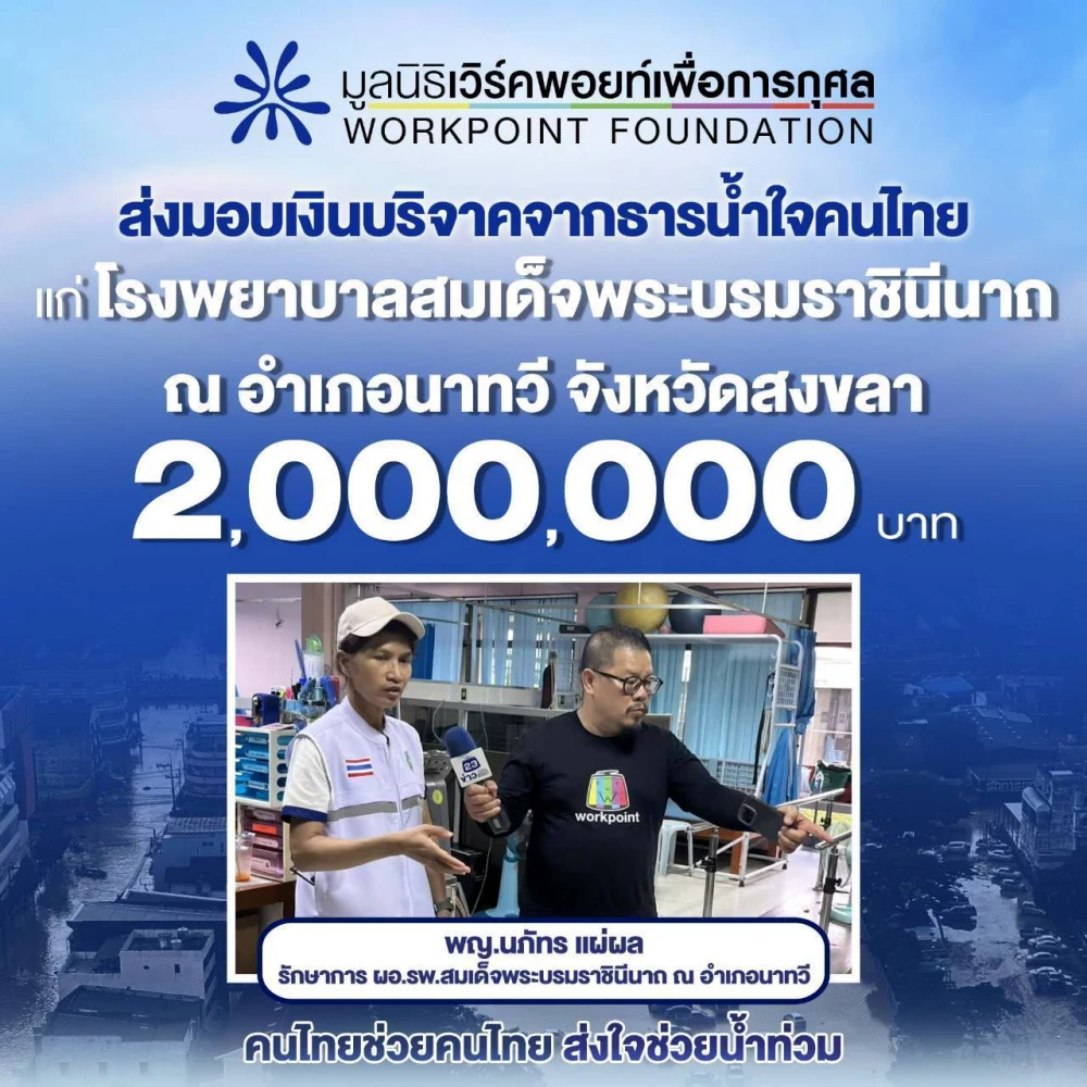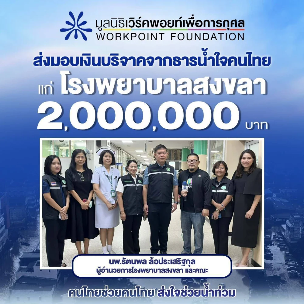 มูลนิธิเวิร์คพอยท์เพื่อการกุศล ส่งมอบเงินบริจาคจากธารน้ำใจคนไทย แก่โรงพยาบาลสงขลานครินทร์ จำนวน 2,000,000 บาท